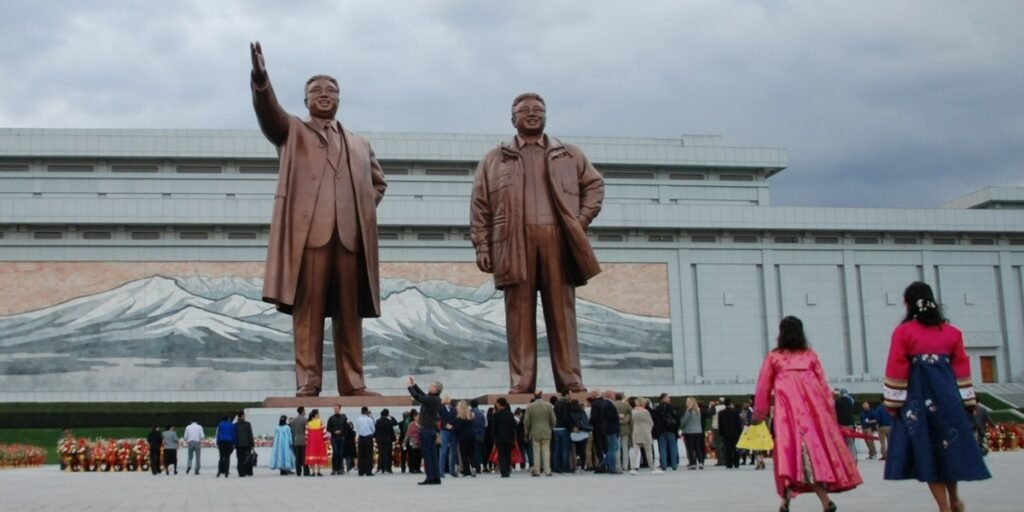 O regime norte-coreano ergueu um elaborado culto à personalidade que exige a lealdade absoluta de seus cidadãos, desde a mais tenra idade. Crianças são doutrinadas a reverenciar os líderes supremos, sendo ensinadas a se curvar diante de retratos de Kim Il-sung e Kim Jong-il, que são exibidos obrigatoriamente em todas as residências, escolas e locais de trabalho. Essa prática é mais do que um simples gesto de respeito; é um pilar fundamental da ideologia estatal “Juche”, que eleva os líderes a um status quase divino, posicionando-os como figuras centrais da vida e da salvação do povo. A rotina diária é meticulosamente planejada para reforçar essa devoção, com rituais que incluem recitar normas ideológicas, depositar flores em monumentos dedicados aos Kims e participar de cerimônias oficiais do Estado. A recusa em cumprir essas práticas não é meramente vista como insubordinação, mas sim interpretada como um ato de traiçoeira oposição ao Estado, com consequências que podem variar de severas punições a campos de trabalho forçado.